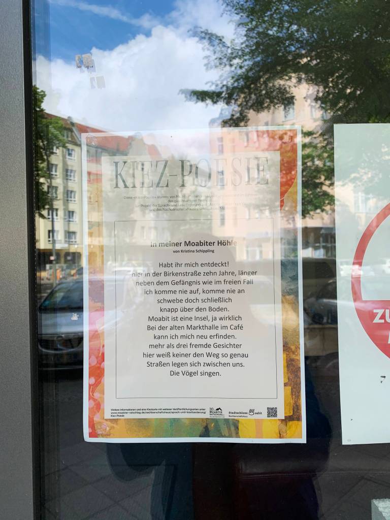 Wer in Berlin, Moabit, gerade ist und Lust auf einen Spaziergang hat, dem kann ich einen ganz besonderen, poetischen Spaziergang empfehlen. Es hängen nämlich gerade Gedichte in Moabit und über Moabit in den Cafés, Spätis usw. aus im Rahmen des KIEZ-POESIE Projekts, bei dem ich mich beworben habe und die auch meine drei Gedichte ins Projekt hineingenommen haben. Auch ist noch ein Audiowalk geplant. Eine etwas andere Art der Publikation, spannend auf jeden Fall!!!