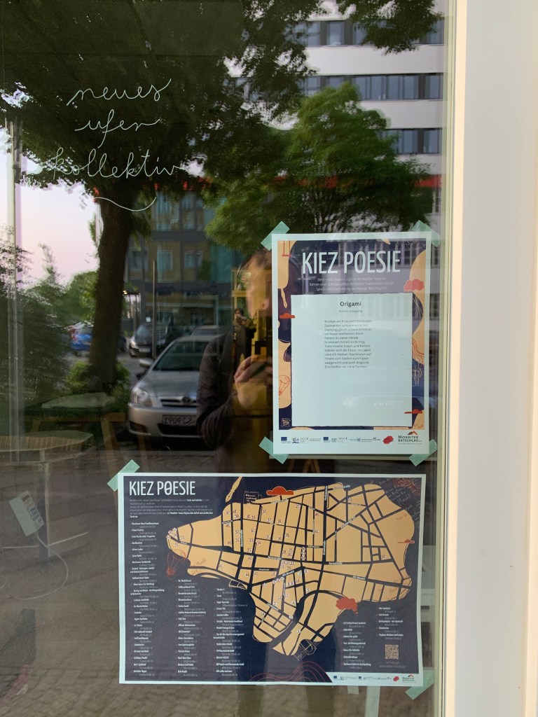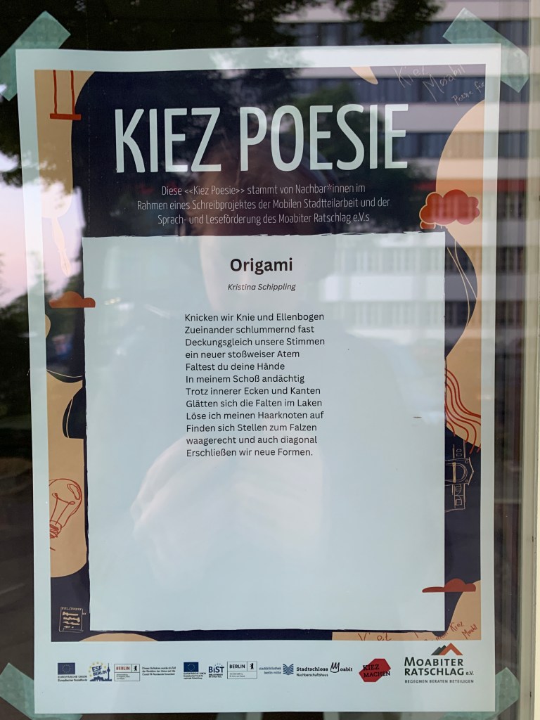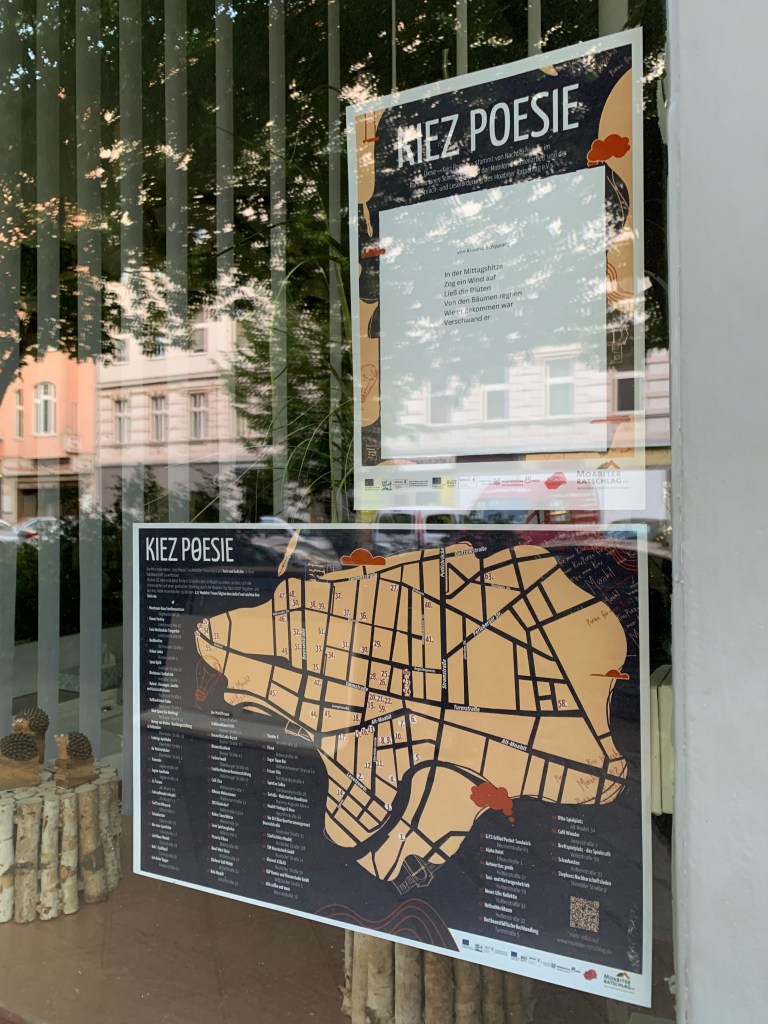 Zum zweiten Mal wurden Gedichte von mir in Moabit in den Schaufenstern der Läden und Restaurants ausgehangen. Das Kiez-Poesie Projekt vom Moabiter Ratschlag e.V. fand wieder statt und heute habe ich bei einem gemeinsamen Spaziergang meine Gedichte im Freien vorgetragen. Eine Lesung auf der Bühne folgt. Ihr seid herzlich eingeladen, durch Moabit zu wandern und dabei die Gedichte in den Schaufenstern zu lesen!