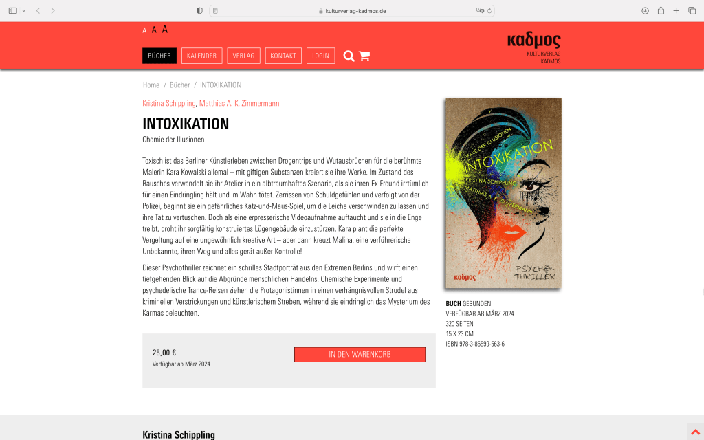 Dies ist eine ganz besondere Ankündigung eines Buchs, das mir sehr am Herzen liegt. Unser Thriller INTOXIKATION wird im Frühjahr beim Kulturverlag Kadmos erscheinen. Dieses Buch habe ich mit dem Maler, Autor und Medienkünstler Matthias A. K. Zimmermann über Jahre in Koautorschaft geschrieben. Es ist ein besonderes Werk und eine besondere Reise. Ich danke for allem Wolfram Burckhardt und dem Kulturverlag Kadmos und natürlich auch Matthias für das Vertrauen, für die Kreativität, für die wundervollen Stunden im Café Wunder. Tausend Dank! Dieses Buch bedeutet alles für mich.