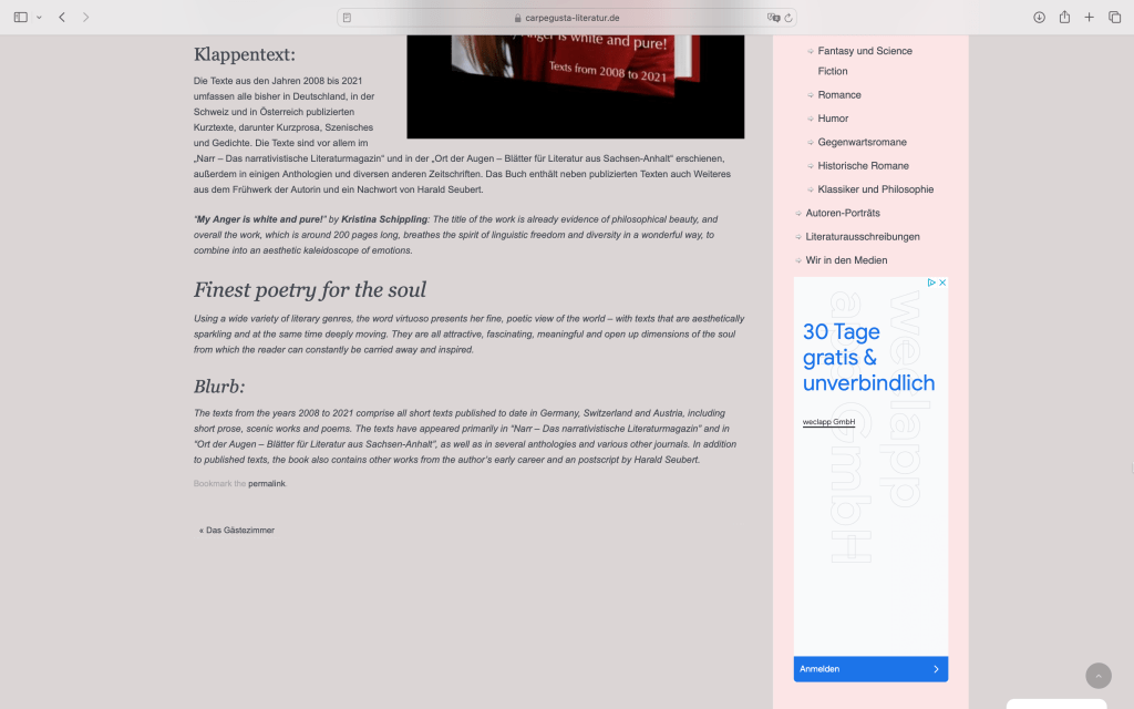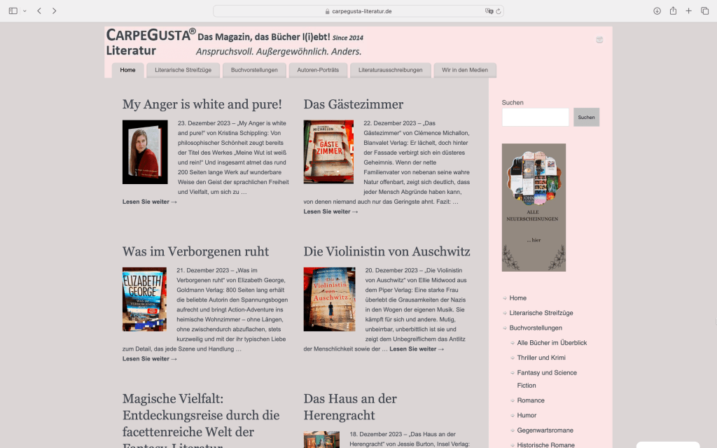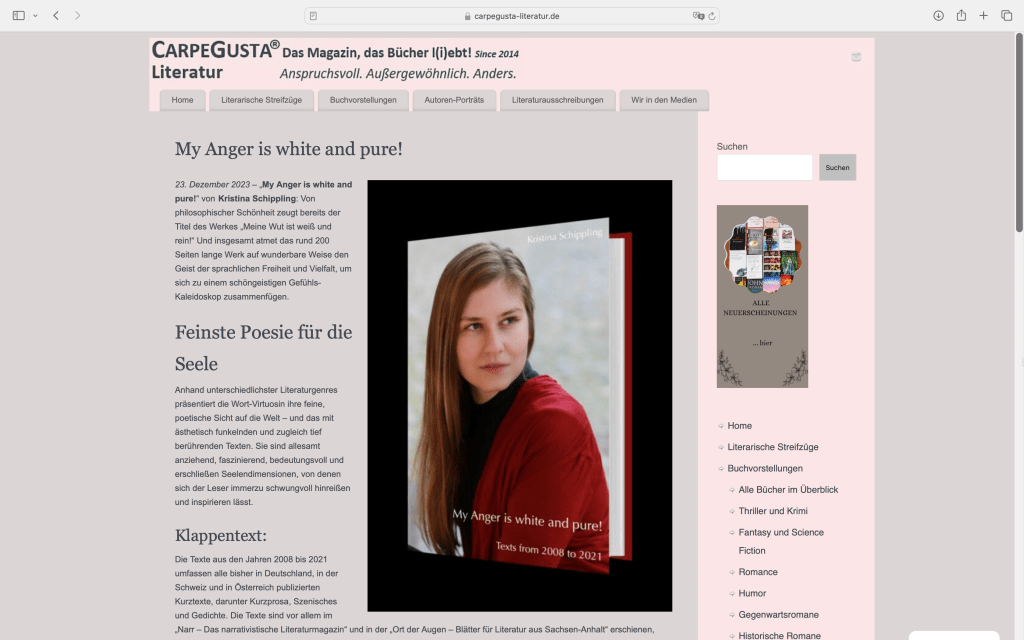 Das ist vielleicht sogar das schönste Weihnachtsgeschenk: Eine wundervolle Rezension zu „My Anger is white and pure!“ ist bei CarpeGusta Literatur – Das Magazin, das Bücher l(i)lebt erschienen. Herzlichsten Dank für diese zauberhafte Buchvorstellung!
