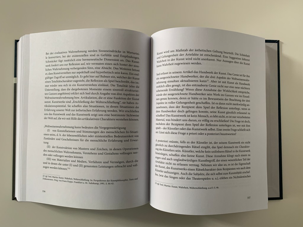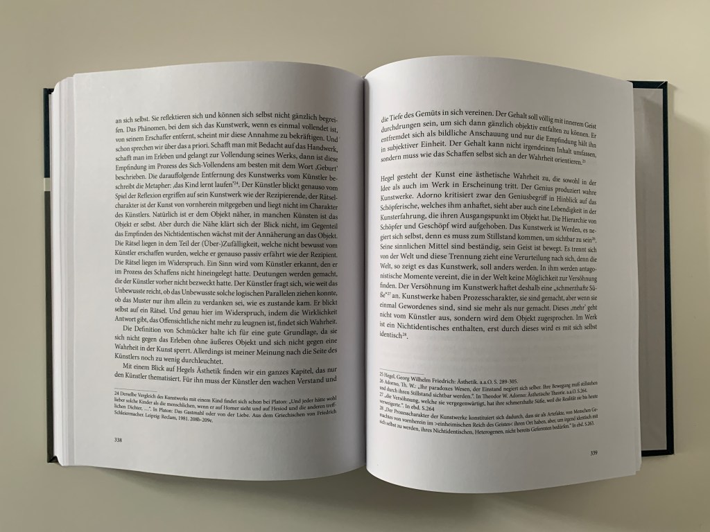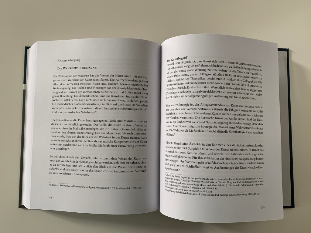 Es ist wirklich eine Ehre zwischen solch renommierten Autoren zu stehen und einen Artikel zu publizieren. „Die Wahrheit in der Kunst“ behandelt verschiedene philosophische ästhetische Theorien und steht meiner Kunstpraxis, die ich auch als Praxis des Erforschen verstehe, sehr nahe. Wenn ich beschreiben könnte, was mich persönlich im tiefsten Inneren ausmacht, dann würde ich die Poesie und die Philosophie nennen. Den Anfang meines Artikels möchte ich gern mit euch teilen. Ich danke allen herzlich, die diese Publikation möglich gemacht haben. Vor allem PalmArtPress und Prof. Harald Seubert. Auch gedenke ich Reinhard Knodt, den ich persönlich noch kennen lernen durfte.