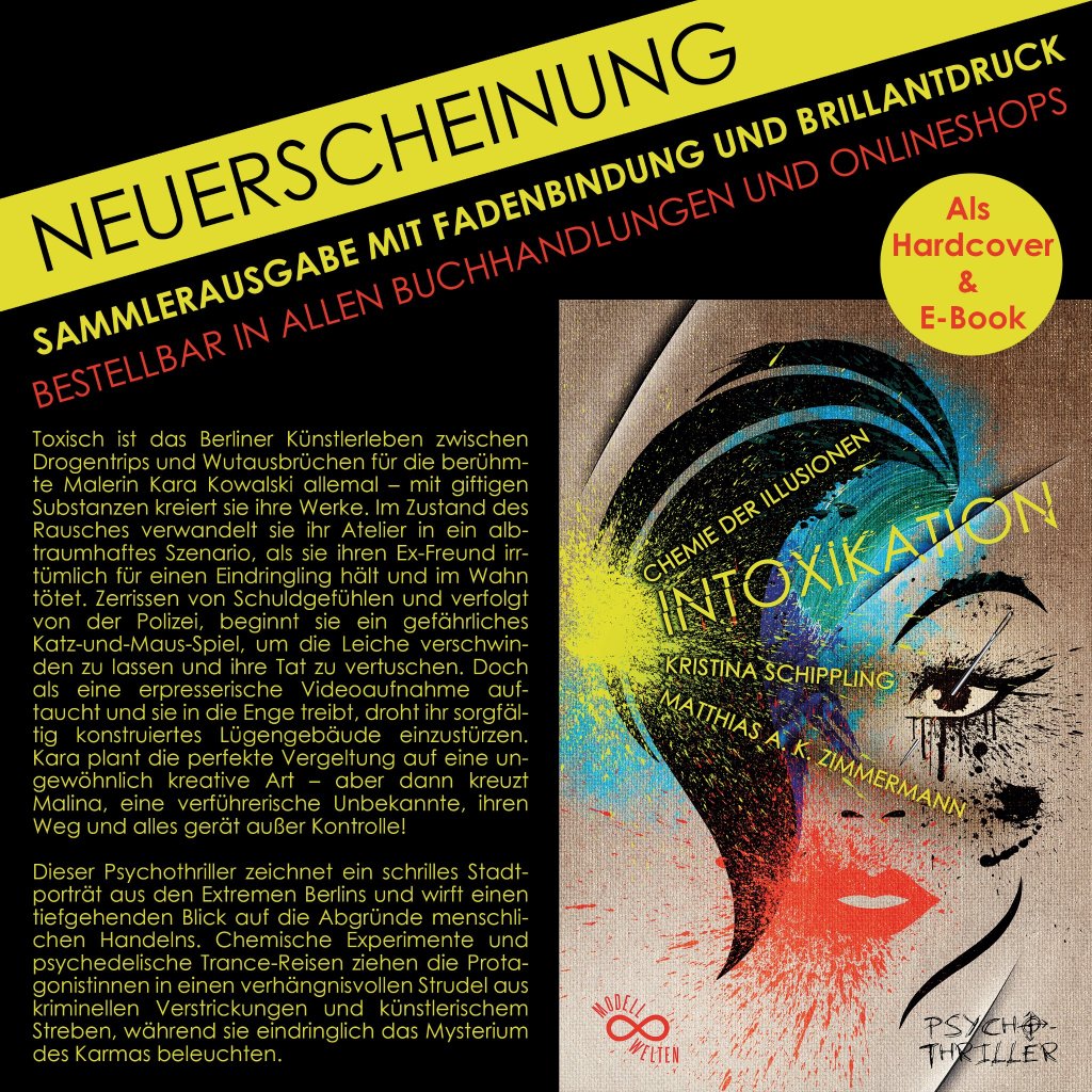 Unser Psychothriller „Intoxikation“ ist noch einmal neu erschienen als Sammlerausgabe mit Fadenbindung und Brillantdruck! Bestellbar in allen Buchhandlungen und Onlineshops! Als Hardcover und E-Book!