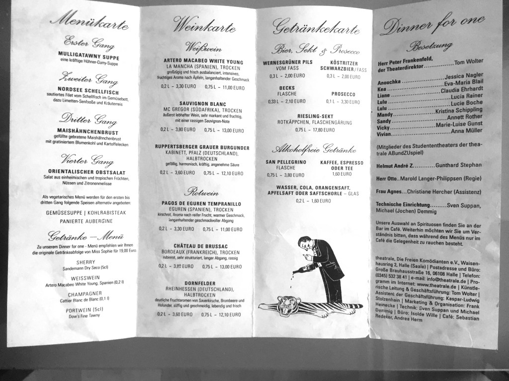 “ ‚Man ist, was man isst‘ – sagt der Volksmund vollmundig. Zumindest auf Händel trifft das zu: Er aß viel und war ganz Großer. Bei den Händelfestspielen rückt die Theatergruppe ABundZUspiel dem Meister deshalb zur Abwechslung mal kulinarisch zu Leibe. ‚Das Gastmahl des Senesino‘ heißt ihre Dinnertheaterproduktion.“