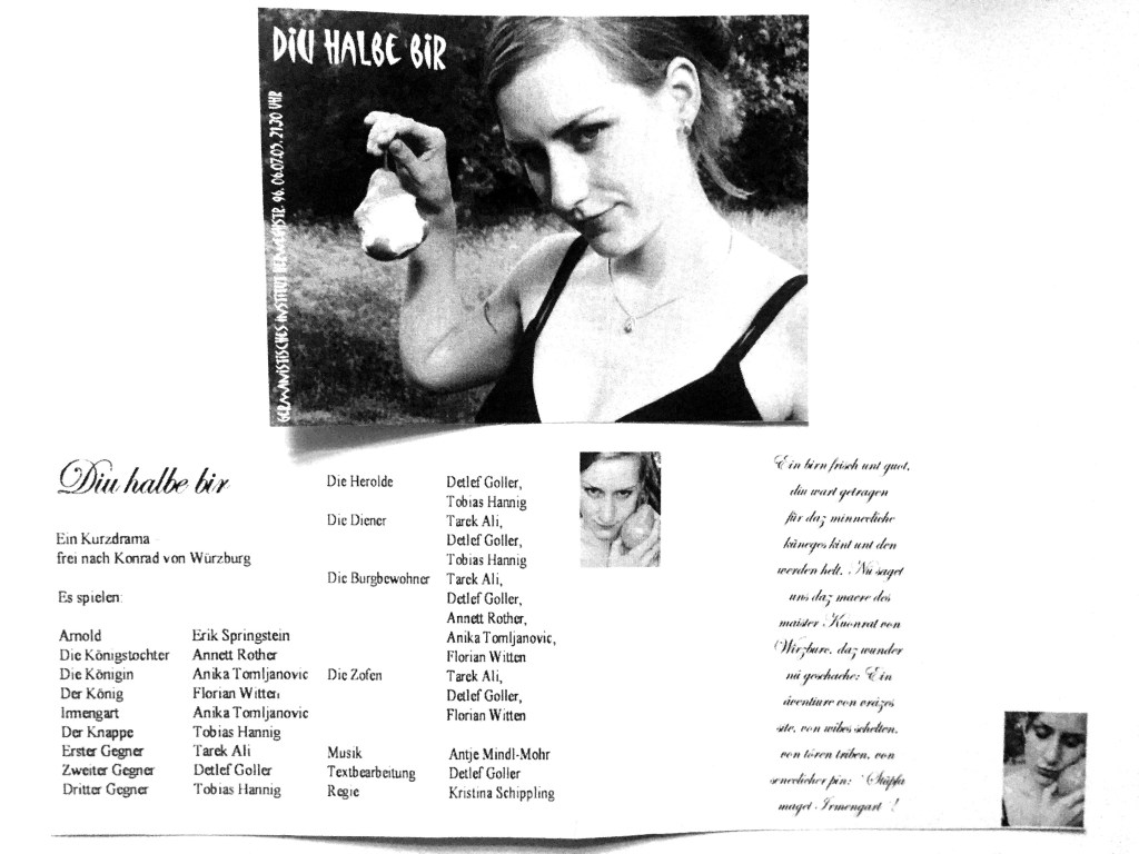 „Die Idee zu dem ‚Event-Theater‘ hatte die 23-jährige Kristina Schippling. Sie führte Regie und schrieb das Stück für die, noch namenlose, Schauspiel-Truppe.“