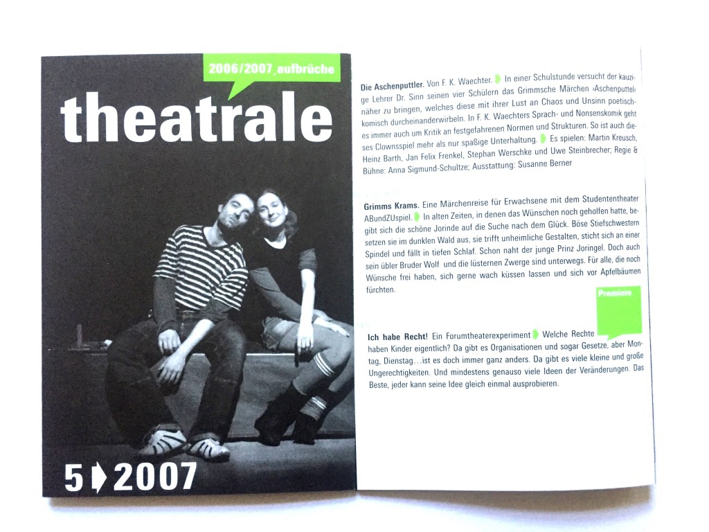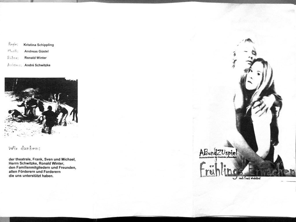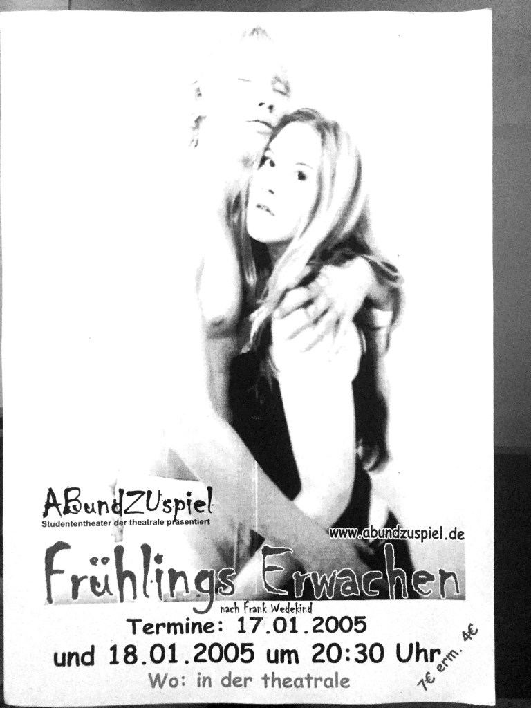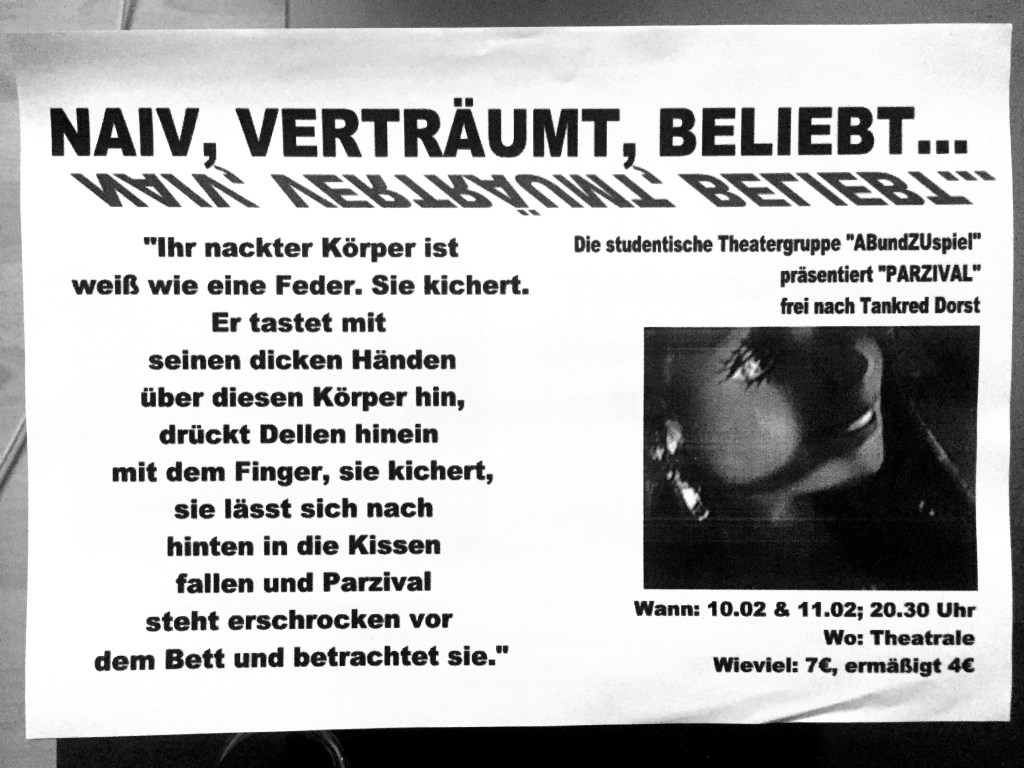 „Viele Ensembles hatte sich Kristina Schippling schon angeschaut, selten fühlte sich die Lehramtsstudentin wohl: zu strenge Hierarchie, schlechte Leiter. So gründete sie 2003 mit einer Freundin eine eigene Gruppe. ‚Ich bin über den Uniplatz gelaufen und habe die Leute angequatscht, ob sie nicht Lust auf Theater haben‘, erzählt die 22-Jährige. Das Studententheater ABundZUspiel war geboren. Mit ‚Parzival‘ nach Tanker Dorst stand im Winter 2003 die erste Premiere auf dem Programm.“