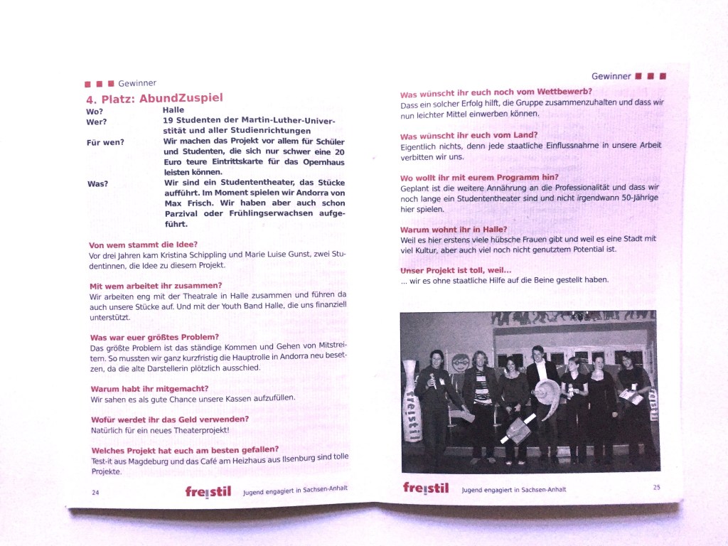 Handel, Michael: Fast wie ein zweites Studium. Beim Studentenensemble ABundZUspiel gilt das Rotationsprinzip. In: AHA! Alles Halle. 04.2006, S. 18.