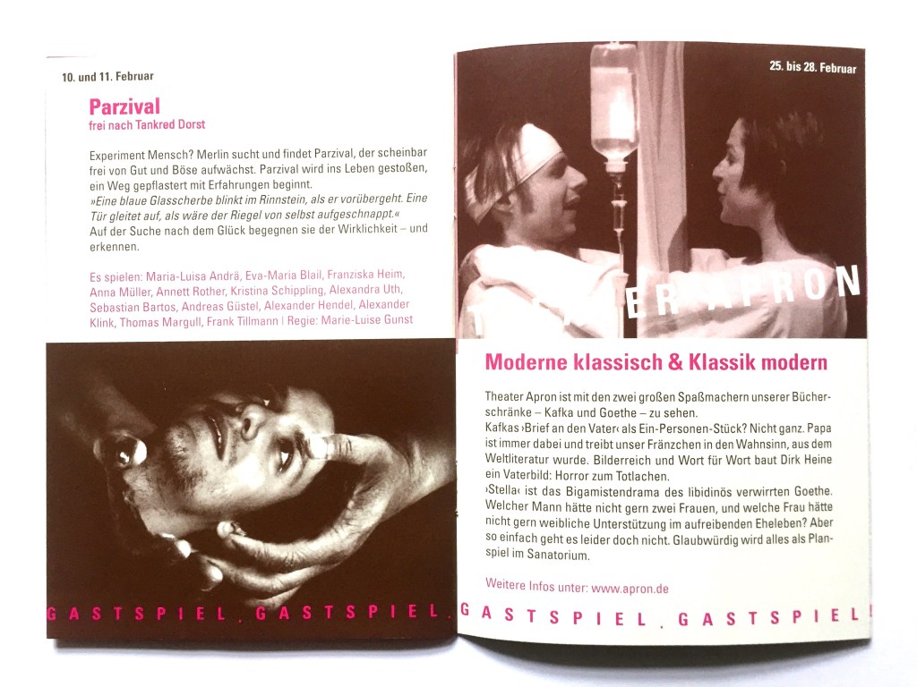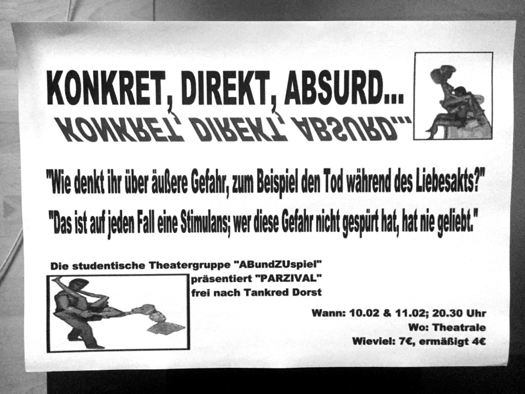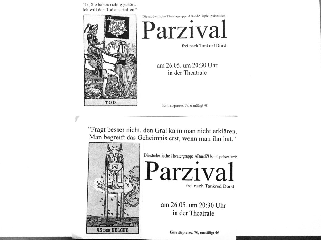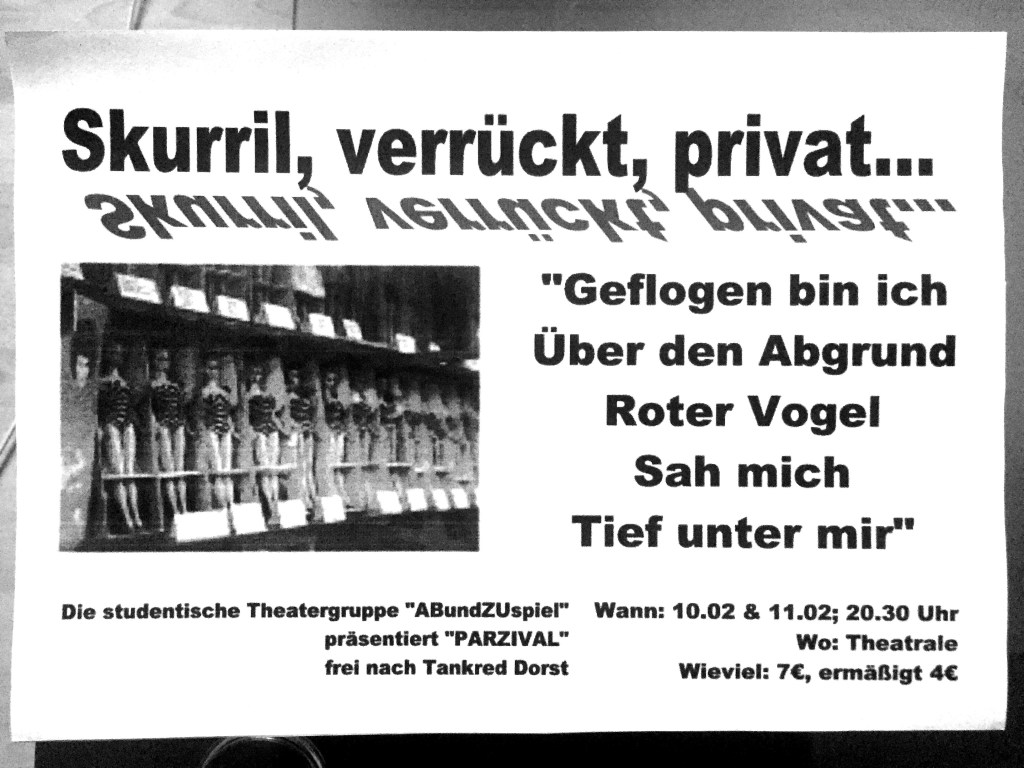 „Idealisten braucht die Welt. In Halle gab es vor anderthalb Jahren drei Handvoll Schauspieler, die endlich Theater spielen wollten, wie sie es für das Beste hielten. An vorderster Front Marie-Luise Gunst und Kristina Schippling. Auf der Suche nach Gleichgesinnten wurden die unter Studenten aller Fakultäten fündig, und so entstand das Theater „ABundZUspiel“. Jenes hat mit „Parzival“ – seinem letzten Stück – so überzeugt, dass die Theatrale die Truppe als Studententheater des Hauses aufnahm.“